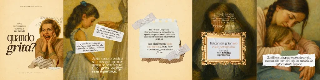 Sim, o design da coleção é exclusivo, estilo colagem clássica com tom acolhedor e criativo. Você pode adaptar imagens, cores e fontes se desejar.
